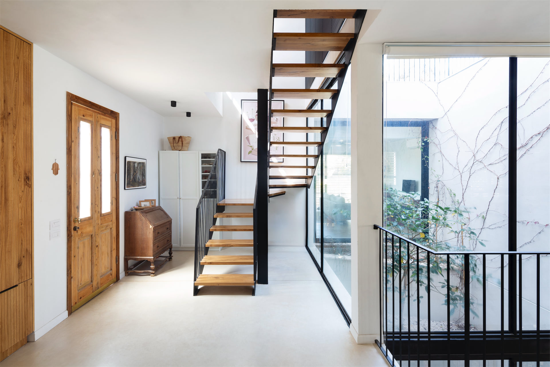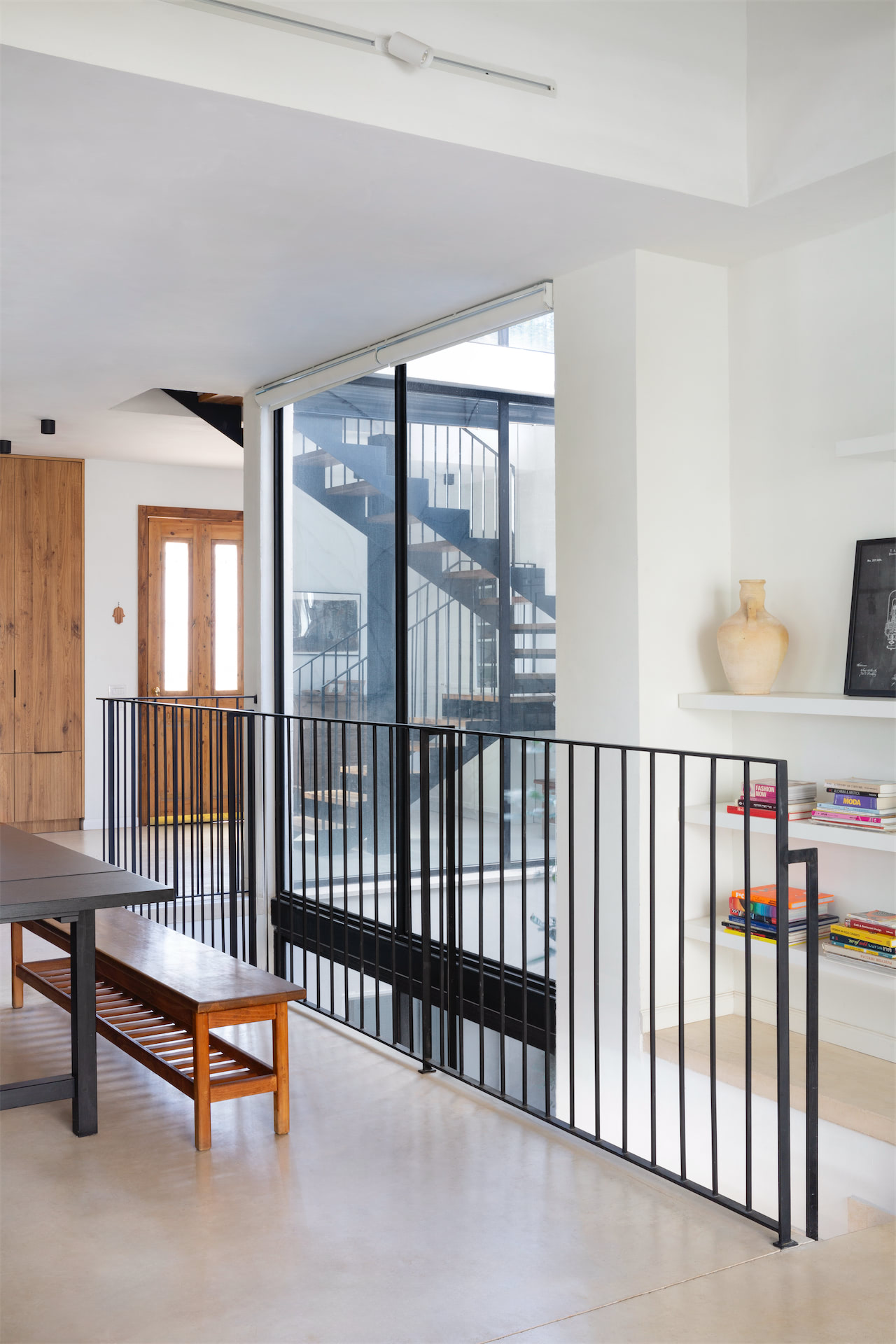 הפטיו עובר לאורך כל שלוש הקומות בבית: הוא מתחיל במרתף ומכניס אור טבעי ואוורור; ממשיך בקומת הקרקע עם שלוש חזיתות זכוכית שמאפשרות שקיפות וזרימת מבטים, אור ואוויר; ומטפס עם גרם המדרגות עד לקומה העליונה ומרפסת הגג הפתוחה.